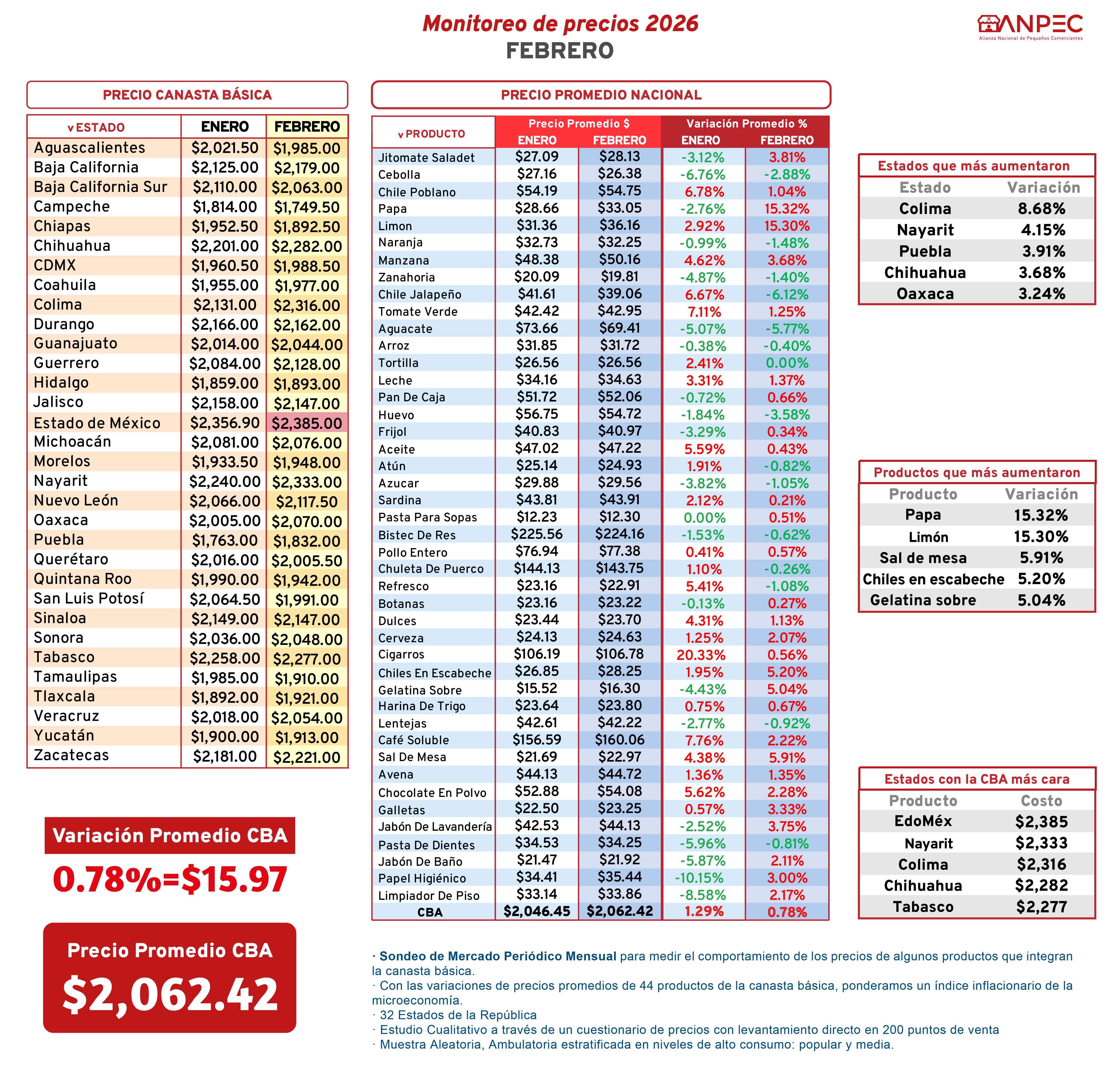 VerANPEC reporta que el precio promedio de la Canasta Básica Alimentaria (44 productos) se ubicó en $2,062.42, con un incremento mensual de 0.78% (equivalente a $15.97). Los estados con mayor variación fueron Colima (8.68%), Nayarit (4.15%), Puebla (3.91%), Chihuahua (3.68%) y Oaxaca (3.24%). Y los estados con la canasta más cara: Edomex ($2,385), Nayarit ($2,333), Colima ($2,316), Chihuahua ($2,282) y Tabasco ($2,277). Entre los productos que más subieron destacan: papa (15.32%), limón (15.30%), sal de mesa (5.91%), chiles en escabeche (5.20%) y jabón de lavandería (3.75%).  El boletín advierte que la incertidumbre por el T-MEC, el freno al nearshoring y la caída de remesas, sumados a problemas internos, sostienen un entorno de presión económica y estancamiento.