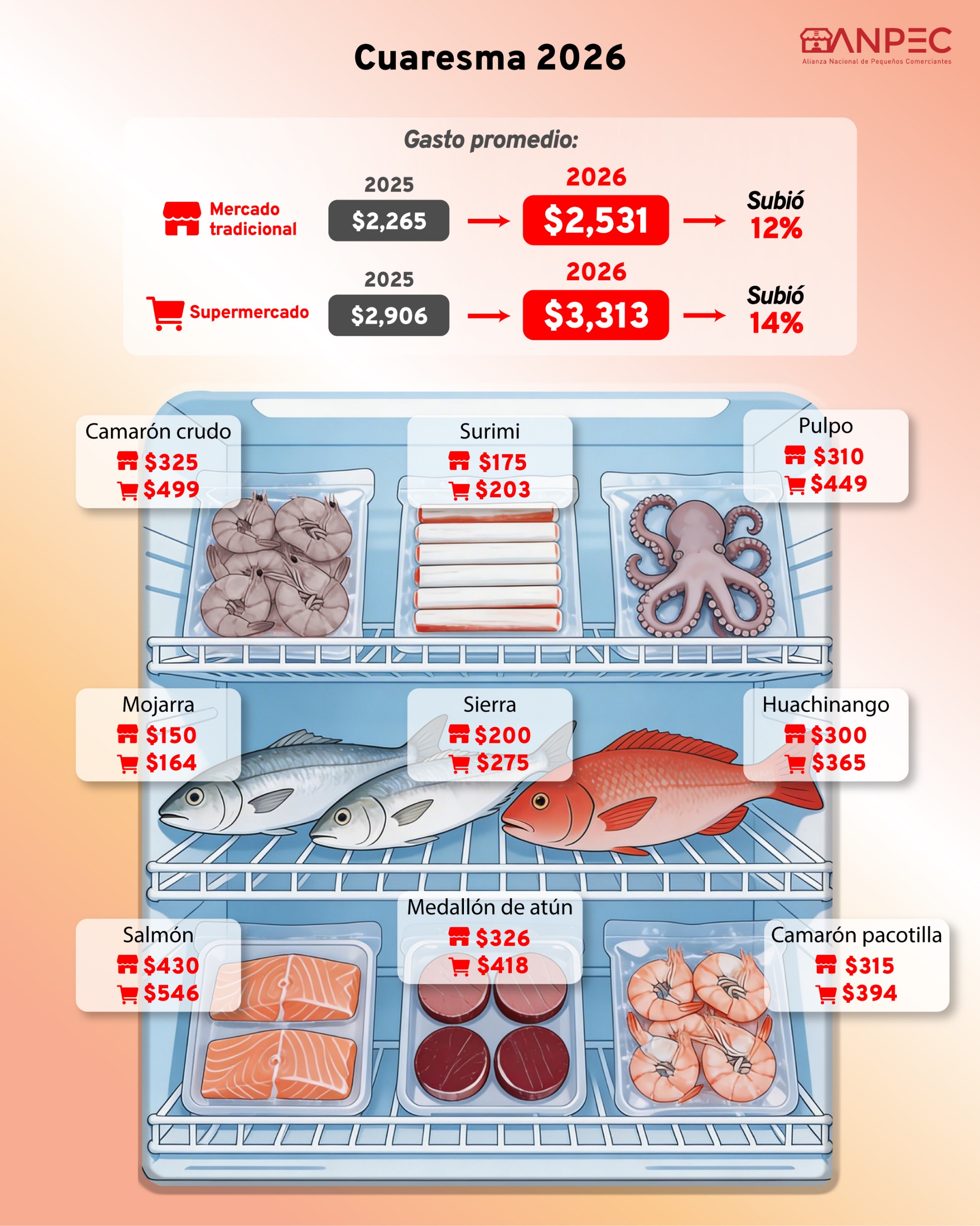 VerLa Cuaresma 2026 inició el 18 de febrero y durante este periodo suele aumentar la demanda de pescados y mariscos. ANPEC registró incrementos de 12% en mercados tradicionales (de $2,265 a $2,531) y de 14% en supermercados (de $2,906 a $3,313) en el conjunto de productos monitoreados. Ante el encarecimiento de la proteína de mar, muchas familias ajustan el menú y sustituyen con mayor frecuencia por leguminosas y vegetales (lentejas, habas, papa y verduras) para rendir el gasto sin dejar de cumplir la tradición. En un entorno de inflación alimentaria sostenida, ANPEC hace un llamado a actuar con prudencia y cuidado, especialmente hacia menores y adultos mayores, y a vivir este periodo con sentido comunitario. #BoletínSemanalANPEC #Cuaresma2026 #PazParaTodos