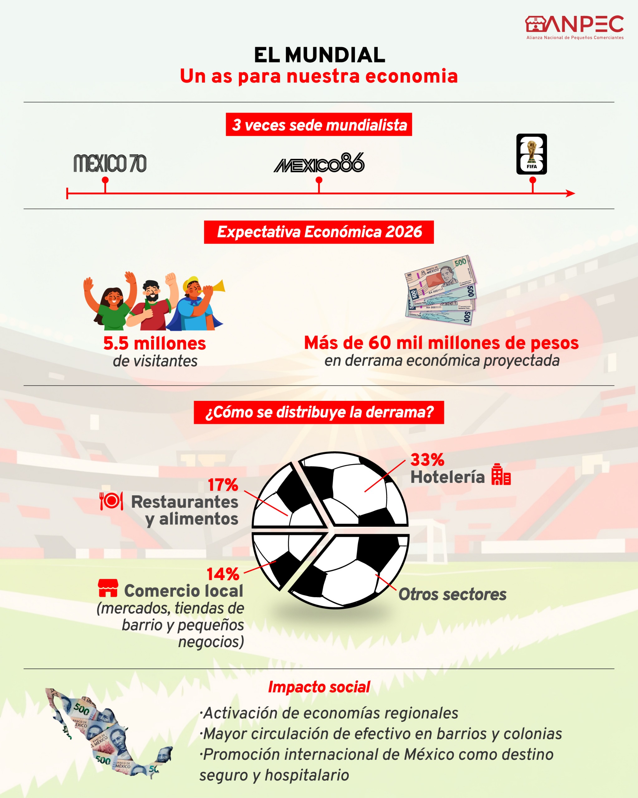 ANPEC proyecta que la Copa Mundial 2026 en México puede generar una derrama económica por encima de 60 mil millones de pesos y la llegada de más de 5.5 millones de visitantes. Lo relevante es cómo circula ese dinero: hotelería (expectativa 20 mil millones), restaurantes (expectativa 10 mil millones) y comercio local (mercados, tiendas de barrio y pequeños negocios) con una expectativa de elevar ventas 14% (≈ 8.5 mil millones). ANPEC subraya un triple efecto positivo: ventaja económica en un momento de inflación e incertidumbre; impulso al mercado interno para recuperar dinamismo; y fortalecimiento del ánimo social y la convivencia.