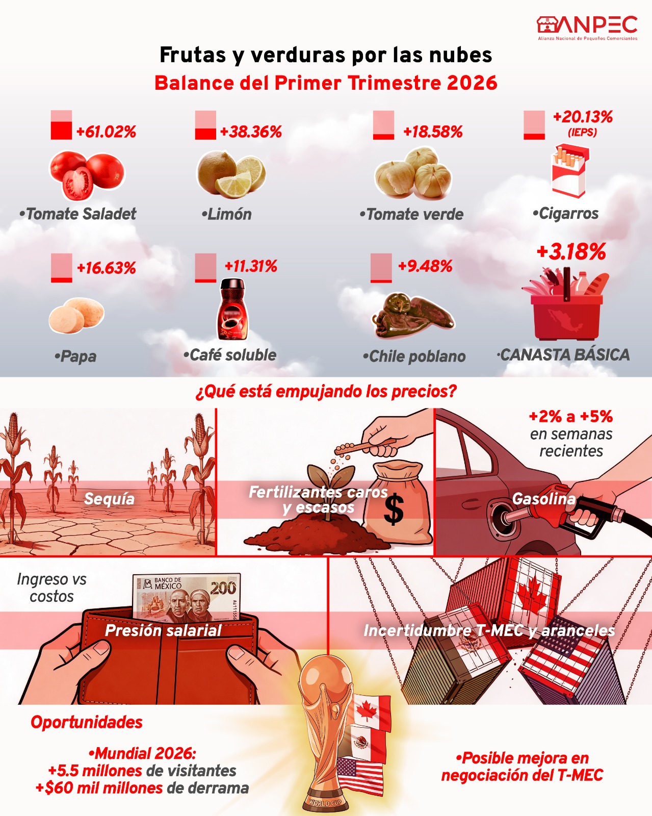 VerANPEC advierte que la inflación alimentaria en México continúa al alza, impulsada principalmente por el encarecimiento de frutas y verduras, que hoy presionan fuertemente el gasto familiar. En el primer trimestre de 2026, el jitomate lidera los incrementos con un alza de 61.02%, seguido del limón (38.36%) y el tomate verde (18.58%), convirtiéndose en los principales factores del aumento en la canasta básica. Otros productos también registraron aumentos importantes: papa (16.63%), café soluble (11.31%) y chile poblano (9.48%). Este fenómeno responde a múltiples factores: sequía, escasez de insumos, aumento en fertilizantes, alza en gasolinas y presiones logísticas, lo que encarece la producción, el abasto y la distribución de alimentos. Además, la incertidumbre comercial y las presiones en costos laborales contribuyen a un entorno inflacionario complejo que afecta directamente el poder adquisitivo de las familias. ANPEC señala que, aunque existen oportunidades económicas hacia adelante —como el Mundial 2026 y una mejor negociación del T-MEC—, el reto inmediato sigue siendo contener la inflación sin frenar la economía.