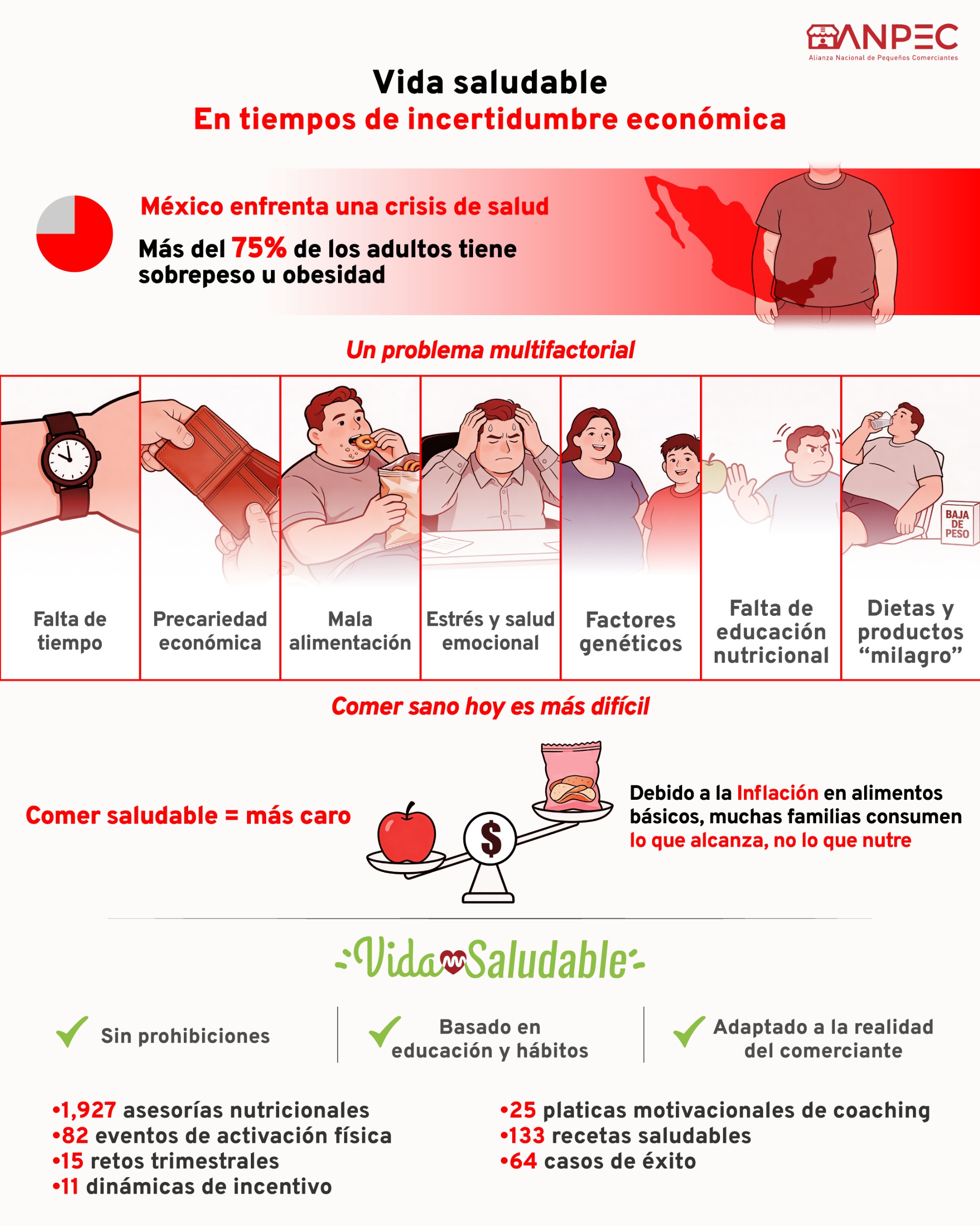 VerMéxico enfrenta una doble crisis: más del 75% de los adultos vive con sobrepeso u obesidad, y al mismo tiempo, la inflación alimentaria hace que comer saludable sea cada vez más caro. El resultado: millones de familias consumen lo que alcanza, no lo que nutre. El sobrepeso no es un problema de voluntad. Detrás hay factores como falta de tiempo, precariedad económica, estrés, sedentarismo y escasa educación nutricional, entre otros. Desde 2023, ANPEC impulsa su programa Vida Saludable con una apuesta clara: educación y hábitos, sin prohibiciones, adaptado a la realidad del pequeño comerciante. Los resultados hablan: 1,927 asesorías nutricionales gratuitas, 82 eventos de activación física, 133 recetas saludables y 64 casos de éxito comprobados. ANPEC lo dice sin rodeos: cuidar la salud también es cuidar la economía. Prevenir enfermedades evita gastos médicos y permite a los comerciantes seguir adelante.