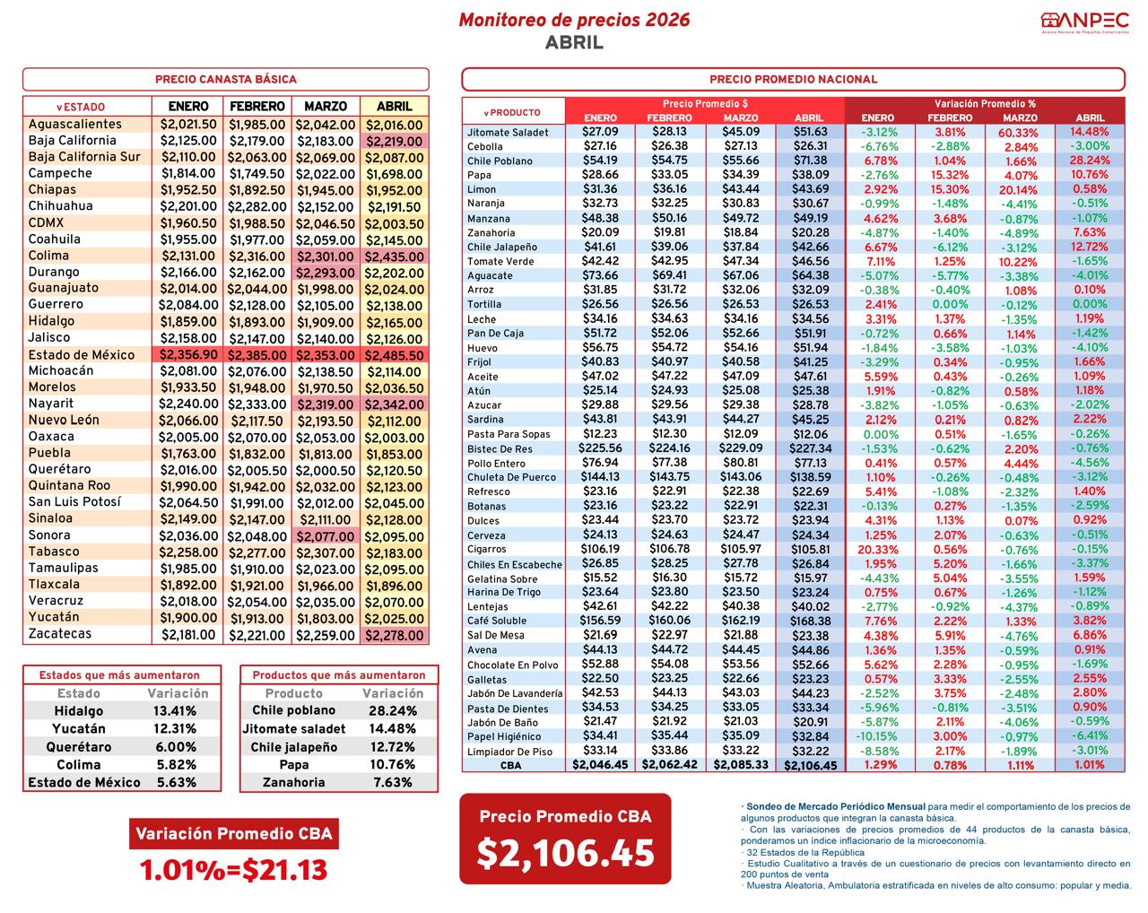 ANPEC reporta que el precio promedio de la Canasta Básica Alimentaria (CBA) llegó a $2,106.45 en abril, un alza de 1.01% respecto a marzo, equivalente a $21.13 más por familia. Los productos que más subieron fueron chile poblano (28.24%), jitomate saledet (14.48%), chile jalapeño (12.72%), papa (10.76%) y zanahoria (7.63%). Los estados con mayor variación: Hidalgo (13.41%), Yucatán (12.31%) y Querétaro (6%). Detrás de estos números hay factores concretos: gasolina premium por encima de $29 pesos el litro, diésel sobre $30, aranceles del 17% al tomate mexicano en EE.UU., sequía, inseguridad y extorsión que encarecen la operación comercial. Ante esto, el gobierno insiste en el PACIC, renovado ya cuatro veces sin resultados. ANPEC sentencia: el PACIC no ha contenido la inflación ni la carestía que afecta a más de 35 millones de hogares. Con el mercado no se pacta, se regula. ANPEC llama a la autoridad a canalizar el apoyo a través del comercio popular: más de 750 mil puntos de venta que atienden al 52% de la demanda nacional y generan 2 millones de autoempleos.